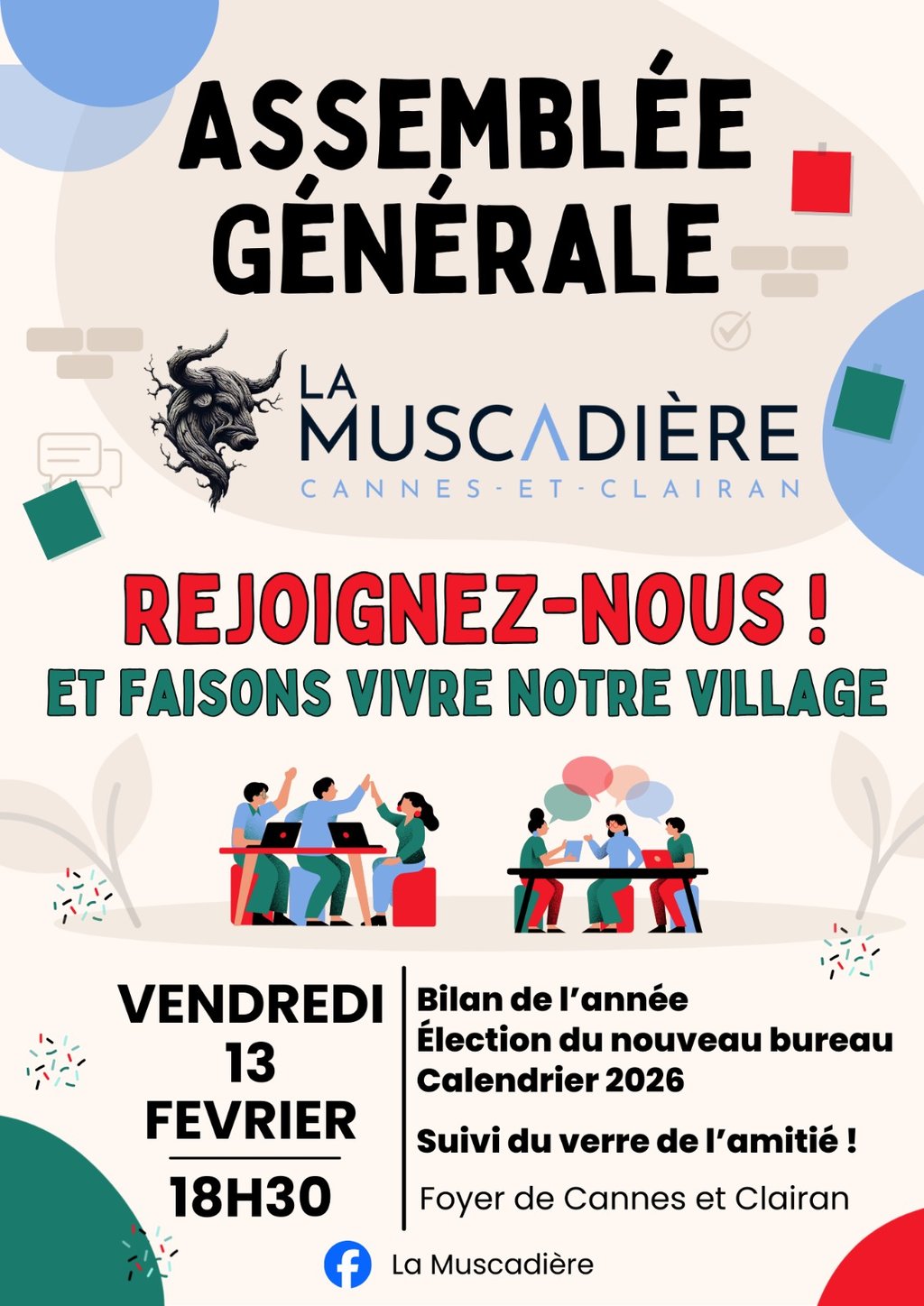 La Muscadière a le plaisir de vous inviter à son Assemblée Générale, qui se tiendra le vendredi 13 février à 18h30 au foyer.